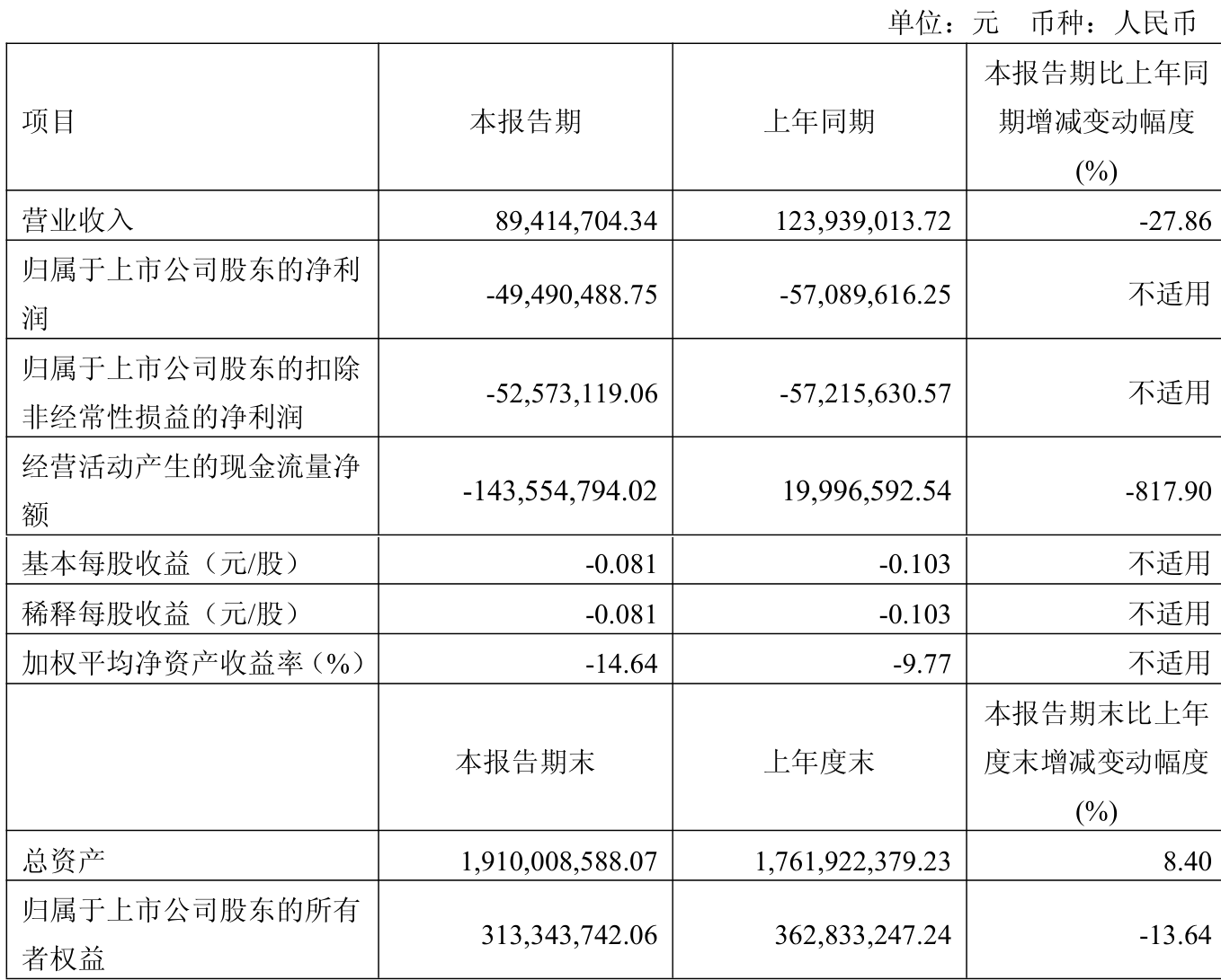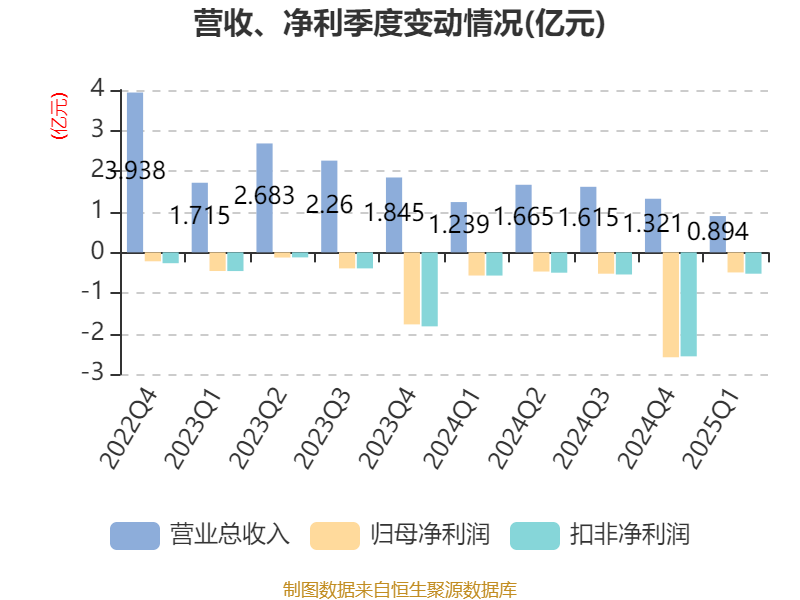 中证智能财讯动力源(600405)4月30日披露2025年第一季度报告。公司实现营业总收入8941.47万元,同比下降27.86%;归母净利润亏损4949.05万元,上年同期亏损5708.96万元;扣非净利润亏损5257.31万元,上年同期亏损5721.56万元;经营活动产生的现金流量净额为-1.44亿元,上年同期为1999.66万元;报告期内,动力源基本每股收益为-0.081元,加权平均净资产收益率为-14.64%。