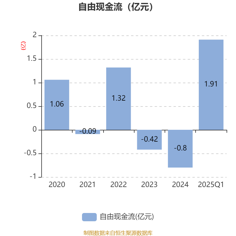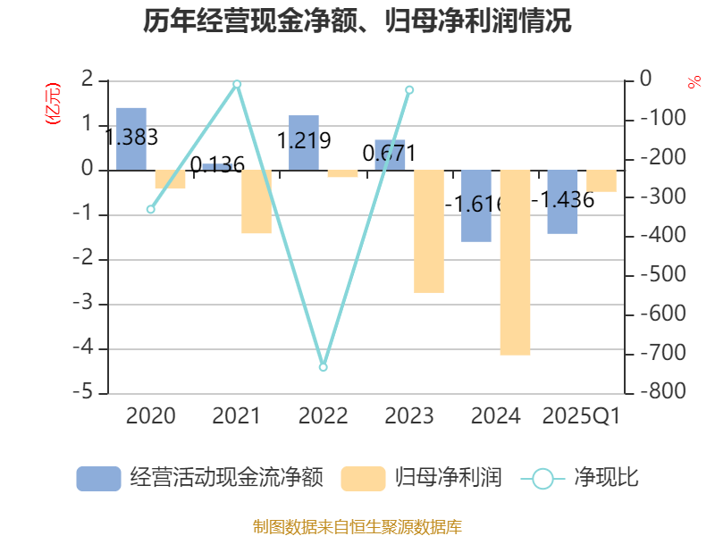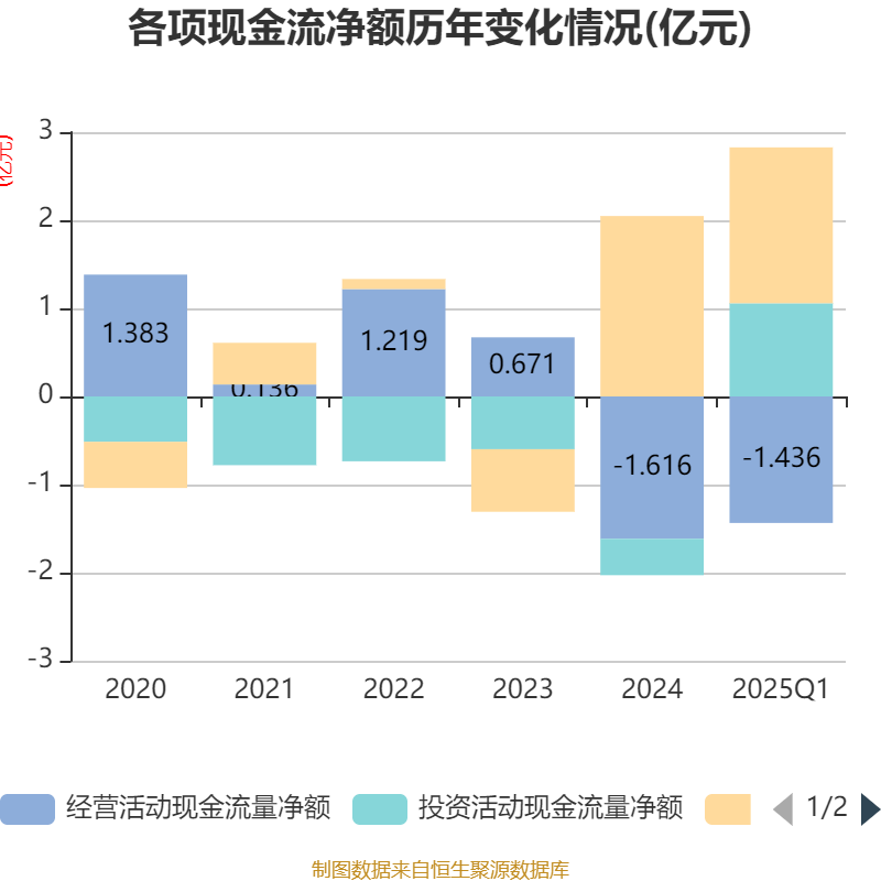 截至2025年一季度末,公司经营活动现金流净额为-1.44亿元,同比减少1.64亿元;筹资活动现金流净额1.77亿元,同比增加9575.98万元;投资活动现金流净额1.06亿元,上年同期为-976.34万元。