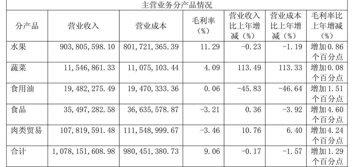分产品来看,宏辉果蔬2024年食用油收入下滑明显,降幅达45.83%,公司水果营收亦出现小幅下滑。宏辉果蔬表示,公司食用油业务主要为食用油的调和加工灌装和代加工业务,收入下滑系受到市场竞争加剧及下游客户需求下降影响所致。