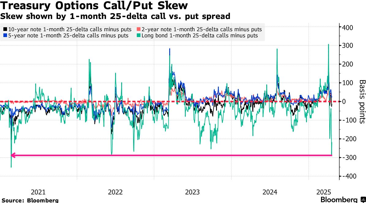 上一次如此偏向看跌期权是在2021年2月25日——当天美国国债市场发生了不寻常的“闪崩”事件,在流动性紧张的情况下价格突然下跌。
